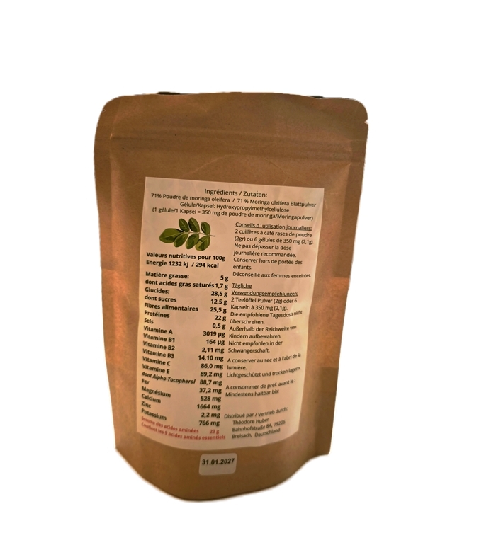 180 gélules de 375 mg de poudre de feuilles de moringa oleifera pur.