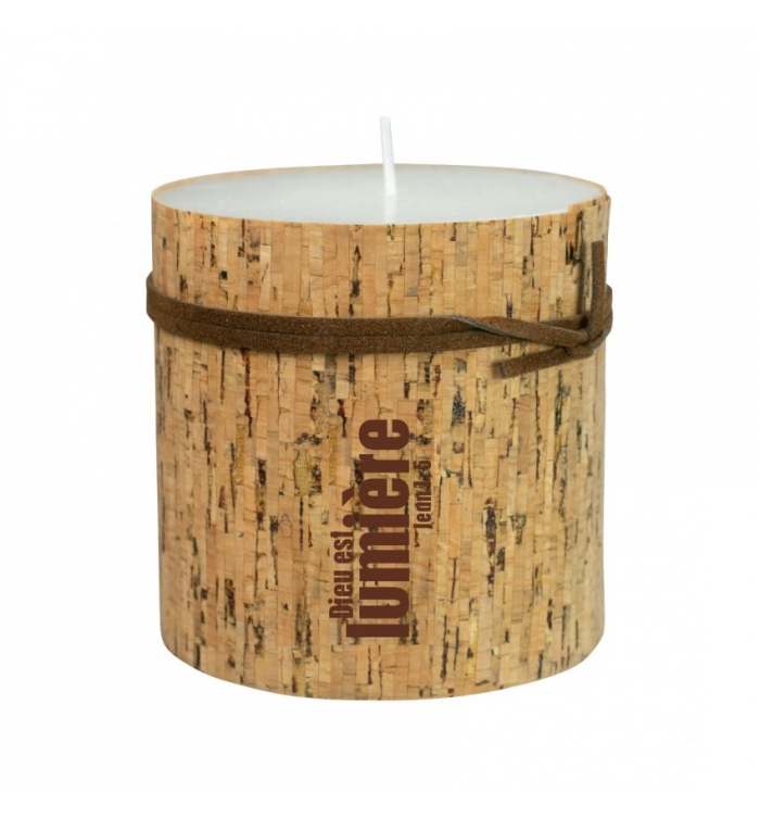 Bougie avec revêtement en liège, entourée d'un ruban en similicuir et le texte "Dieu est lumière", 1 Jean 1:5.