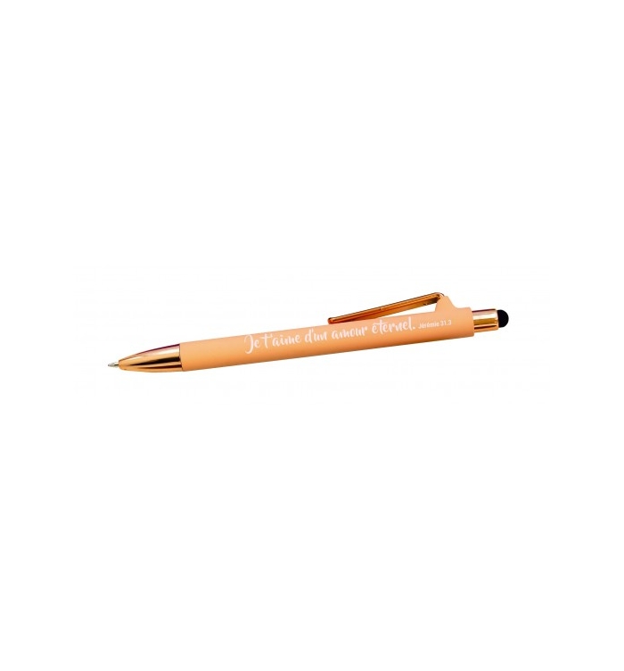 Ce stylo à bille souple est très chic avec sa finition mate et son impression numérique brillante. Grâce à son toucher doux, il est agréable à tenir en main. L'impression du verset Je t’aime d’un amour éternel, n'est pas seulement un message d'inspiration, mais fait de ce stylo un merveilleux compagnon pour la vie quotidienne.