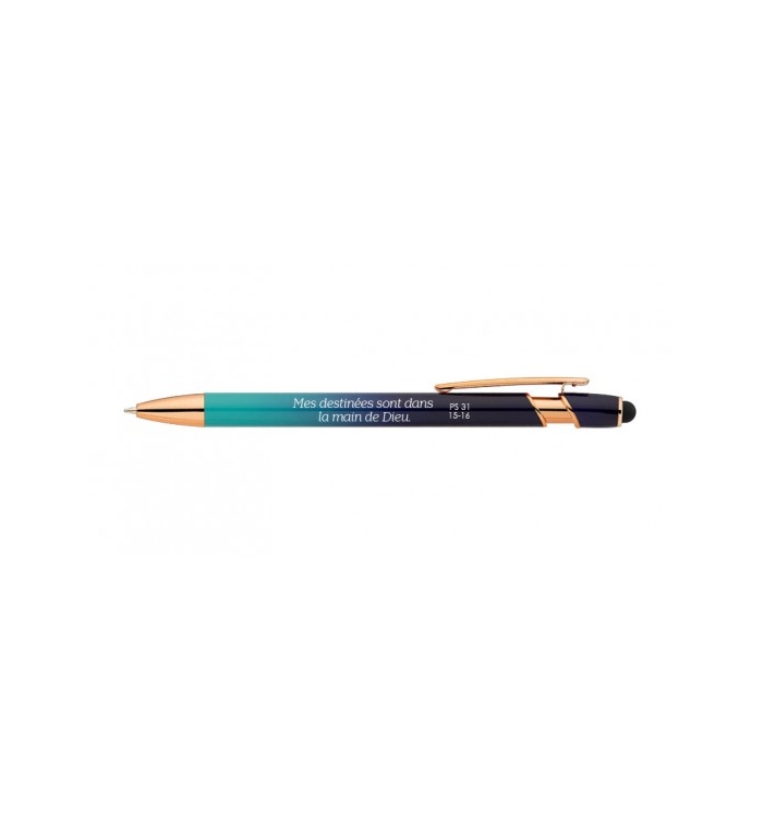 Un stylo sophistiqué, élégant et tendance, orné d'un dégradé subtil et de détails en rose gold, avec le verset "Mes destinées sont dans la main de Dieu." (Ps 31, 15-16).