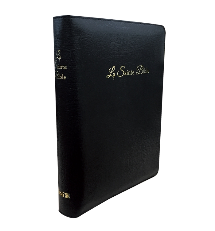 Bible en cuir, avec tranches or, onglets, glissière et coffret. Un livret de mariage est inclus.