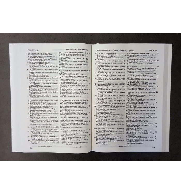 Version Louis Segond TBS. Couverture rigide similicuir, cousue. Pages annexes contenant des renseignements: - Comment retrouver certains passages (liste de 56 textes de l'AT et 128 du NT) - Liste des Paraboles - Liste des miracles de Jésus classés chronologiquement et par ville - Quelques promesses de la Bible quand vous avez besoin de réconfort -Table des rois et des prophètes de Juda et d'Israël - Table des poids et mesures - Monnaies - Glossaire - 7 cartes en couleur.
