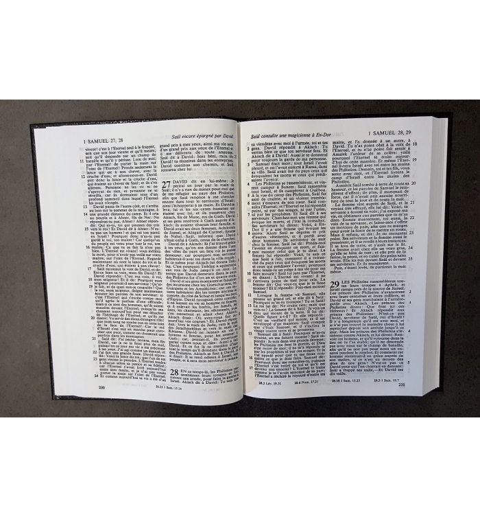 Version Louis Segond TBS. Couverture rigide similicuir, cousue. Pages annexes contenant des renseignements: - Comment retrouver certains passages (liste de 56 textes de l'AT et 128 du NT) - Liste des Paraboles - Liste des miracles de Jésus classés chronologiquement et par ville - Quelques promesses de la Bible quand vous avez besoin de réconfort -Table des rois et des prophètes de Juda et d'Israël - Table des poids et mesures - Monnaies - Glossaire - 7 cartes en couleur.