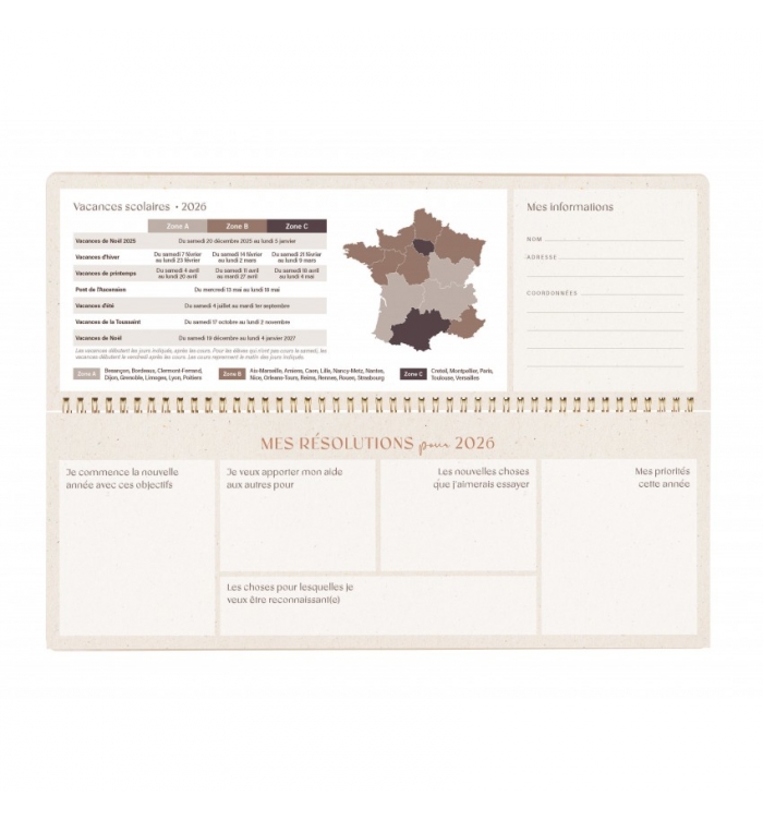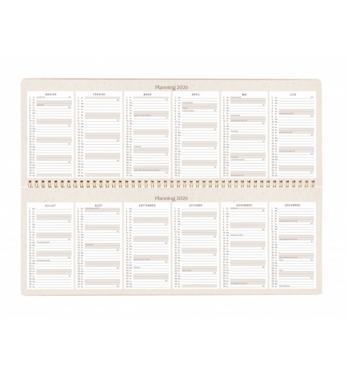 Format : 29,7 x 11 cm (fermé), 29,7 x 22 cm (ouvert), 1 double page par semaine.
