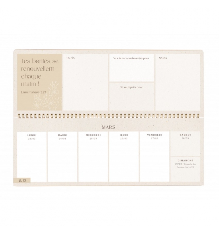 Ce semainier est une invitation à réfléchir consciemment à sa vie et à noter ses pensées et ses prières.