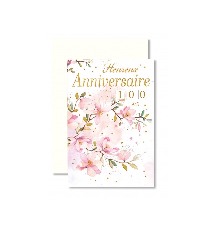 Jolie carte double grand format "Heureux Anniversaire" branches fleuries avec tirettes dorées pour indiquer l'âge de 1 à 100 ans. Le visuel comporte aussi d'autres petits éléments dorés.