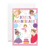 Carte Double Petites filles ballerines, ballons et gâteau d'anniversaire
