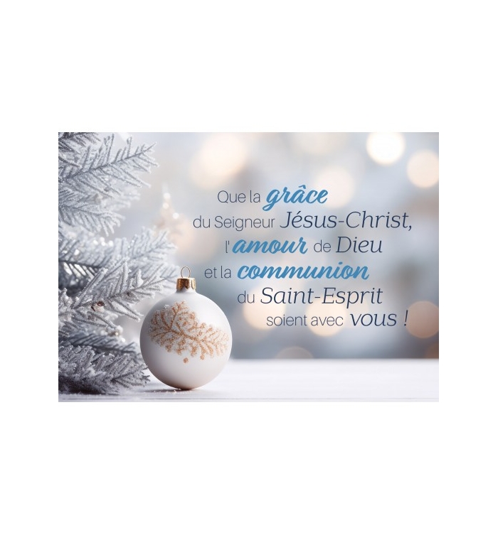 Carte Fin D'année Boule de Noël et branches de sapin enneigées