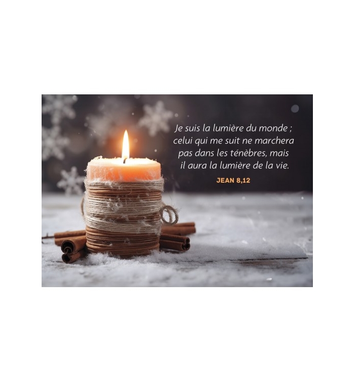 Jolie carte de fin d'année "Bougie et batons de cannelle sur la neige" avec verset biblique. Format : 14,8 x 10,5 cm