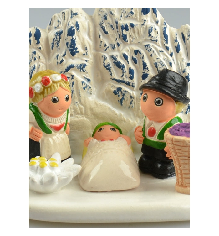 Crèche du Monde - Nativité Région de Trentin, cette jolie crèche artisanale est en céramique peinte à la main. La crèche avec les santons mesure 8 X 7 cm. Une belle idée cadeau pour toute occasion !
