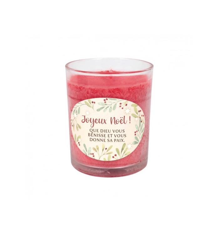 Bougie de Noël parfum Vanille-Cerise avec une étiquette joliment décorée : "Joyeux Noël - Que Dieu vous bénisse et vous donne sa paix".