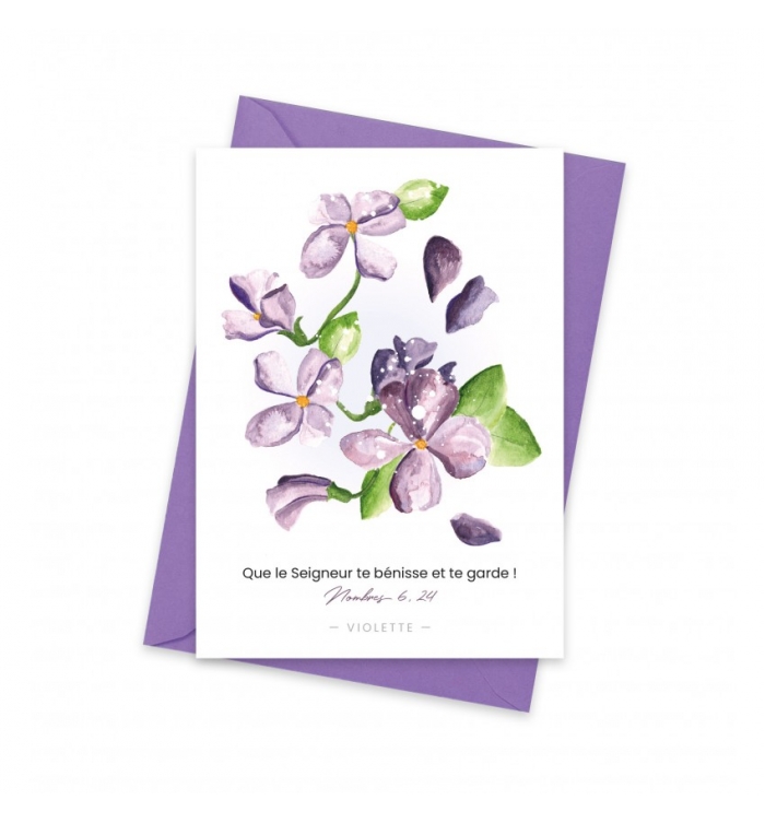 Avec son parfum léger de violettes et le verset biblique "Que le Seigneur te bénisse et te garde", cette carte est une belle façon de montrer votre amour et votre soutien à vos proches. Offrez-la en cadeau...