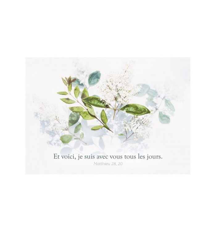 Jolie carte simple avec fleurs blanches et feuilles sur fond blanc et le verset Et voici, je suis avec vous tous les jours. (Matthieu 28,20)