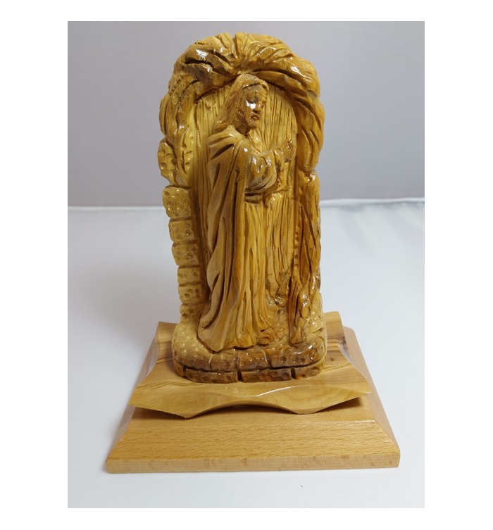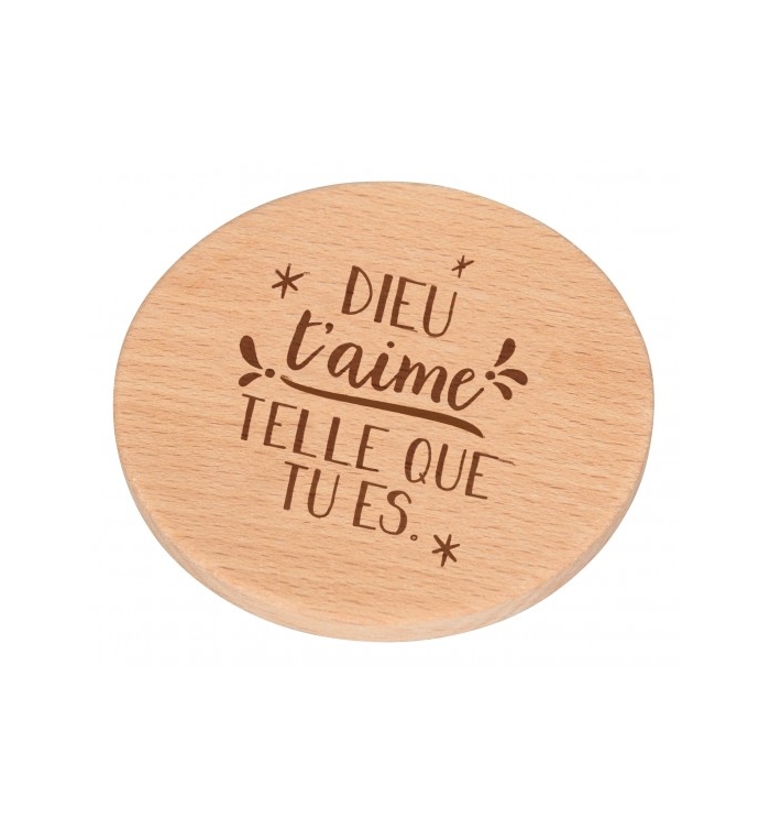 Miroir de poche en bois, gravé au laser avec le texte Dieu t'aime telle que tu es.