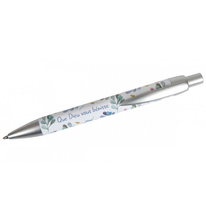 Un joli petit cadeau à offrir ! Stylo à bille entièrement imprimé d'un magnifique motif floral et du texte « Que Dieu vous bénisse ». Clip et pointe en métal, couleur de la mine : bleu