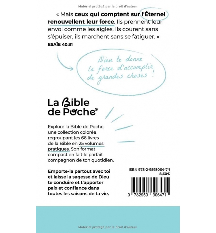 Bienvenue dans La Bible de Poche, une collection colorée rassemblant les 66 livres de la Bible en 25 volumes pratiques. Son format compact en fait le compagnon idéal pour accompagner chaque instant de votre vie. Emportez-la partout avec vous et laissez la sagesse divine vous guider, vous apporter paix et confiance dans toutes les saisons de votre vie.