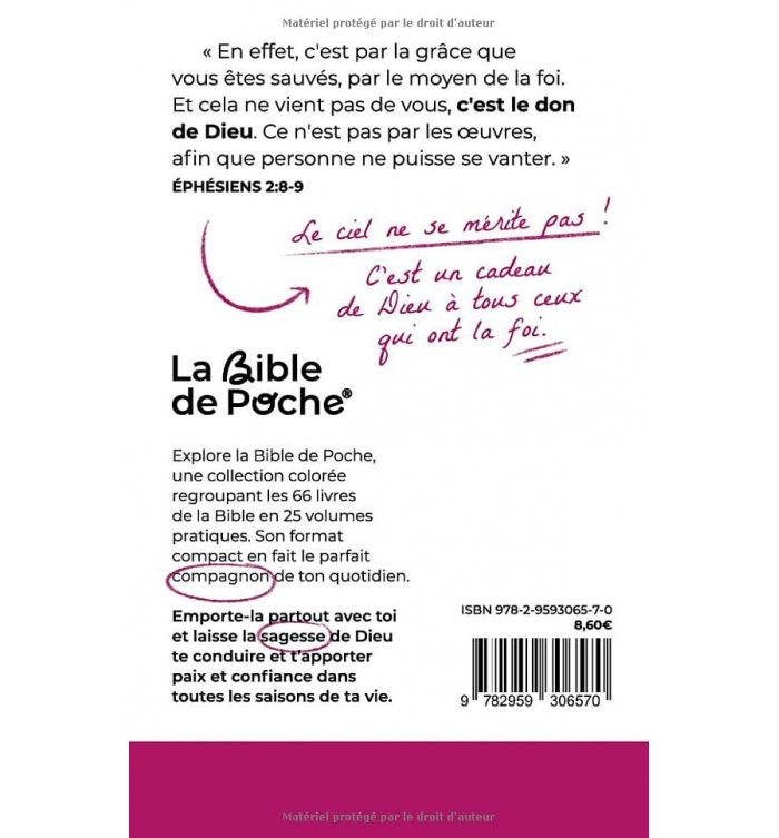 Bienvenue dans La Bible de Poche, une collection colorée rassemblant les 66 livres de la Bible en 25 volumes pratiques. Son format compact en fait le compagnon idéal pour accompagner chaque instant de votre vie. Emportez-la partout avec vous et laissez la sagesse divine vous guider, vous apporter paix et confiance dans toutes les saisons de votre vie.
