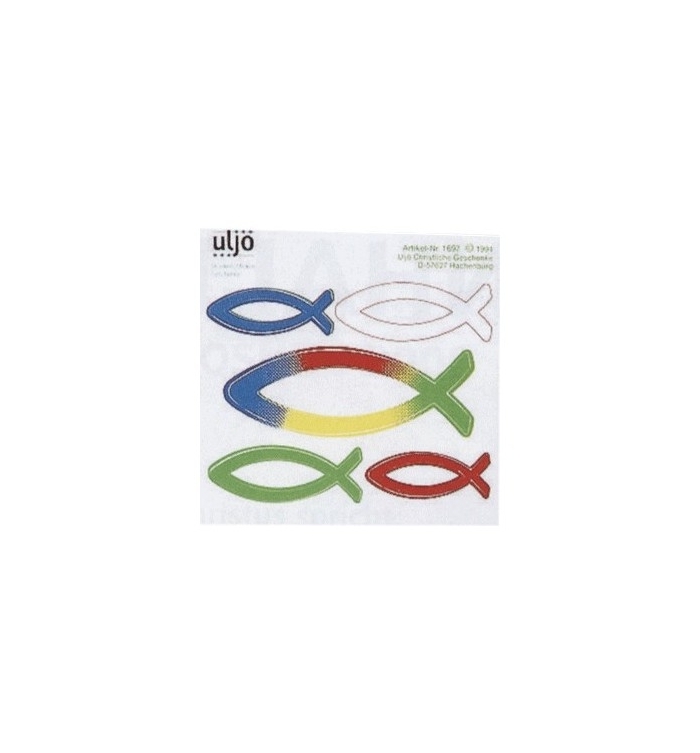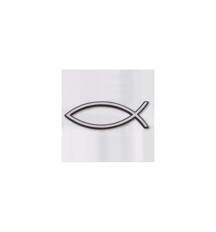 Planche de 29 autocollants argentés Ichtus en 4 tailles : 2, 3, 4,5 et 9 cm Format : feuille 10 x 23 cm