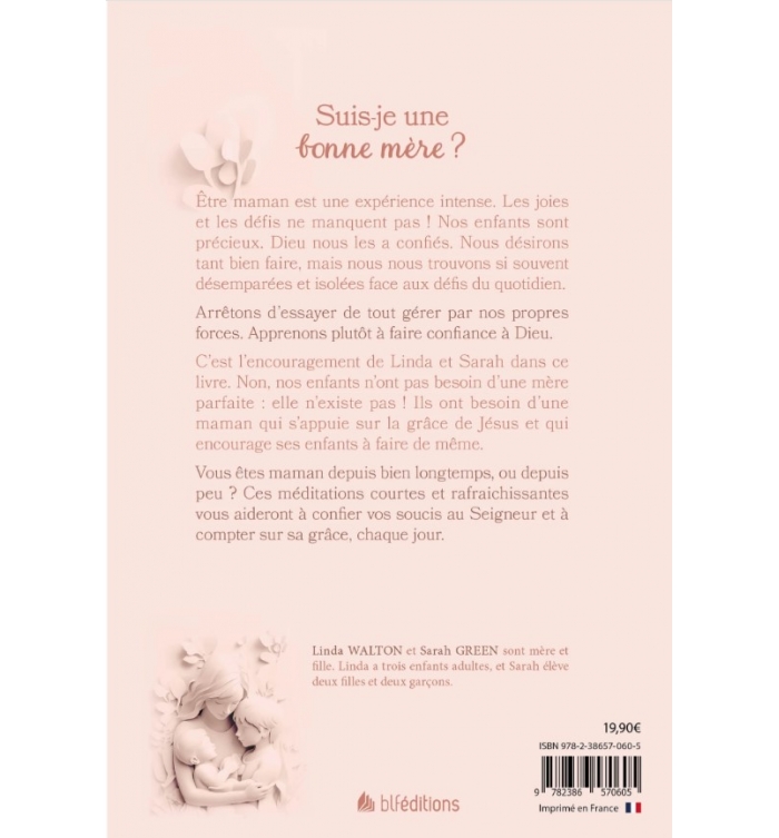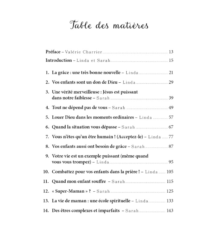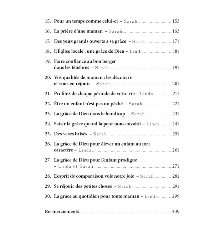 « Arrêtez d’essayer de tout gérer par vos propres forces et apprenez à compter sur Dieu ! » C’est le cri de Linda et Sarah dans ce livre. Non, nos enfants n’ont pas besoin d’une mère parfaite (elle n’existe pas !). Ils ont besoin d’une maman qui se sait faible mais qui compte sur Jésus dans tout ce qu’elle vit.