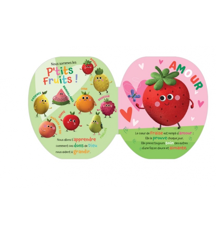 L’amour, la joie, la paix, la gentillesse, la bienveillance, la bonté, la fidélité, la douceur et la maîtrise de soi, sont ici représentés sous la forme de véritables fruits : la fraise – héroïne de ce livre – mais aussi, l’ananas, l’orange, le citron, la pastèque, la pomme, la poire, la framboise et la pêche.
