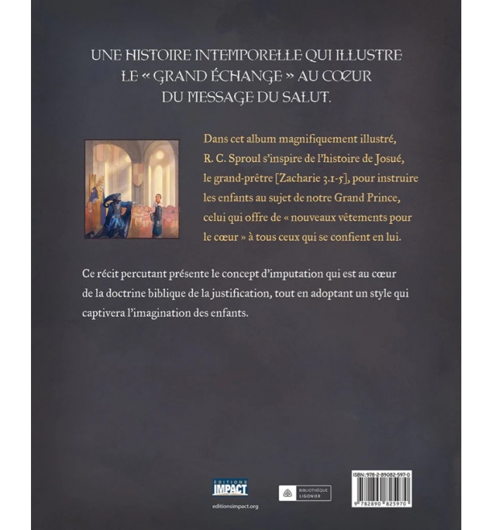 Dans cet album magnifiquement illustré, R. C. Sproul s’inspire de l’histoire de Josué, le grand-prêtre (Zacharie 3.1-5), pour instruire les enfants au sujet de notre Grand Prince, celui qui offre de « nouveaux vêtements pour le cœur » à tous ceux qui se confient en lui.