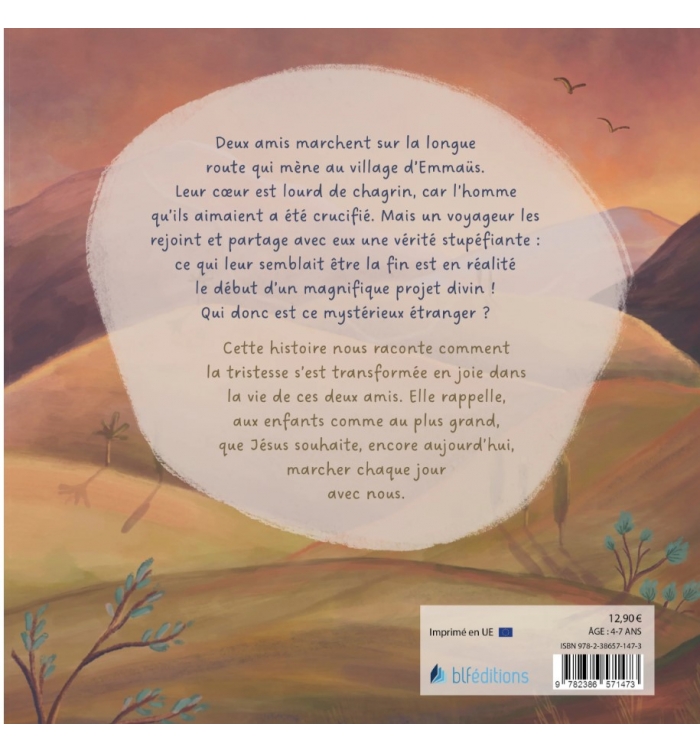 Cette histoire nous raconte comment la tristesse s’est transformé en joie dans la vie de ces deux amis. Elle rappelle, aux enfants comme au plus grand, que Jésus souhaite, encore aujourd’hui, marcher chaque jours avec nous