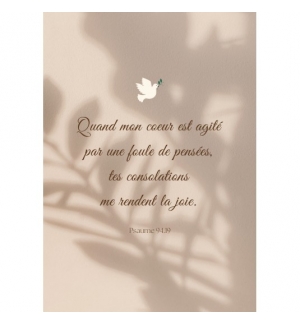 Carte Colombe et ombre de branches sur mur beige avec verset biblique et finition satinée. Format : 14,8 x 10,5 cm