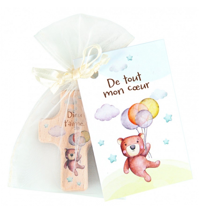 Mini croix en bois d'hêtre "Ourson"