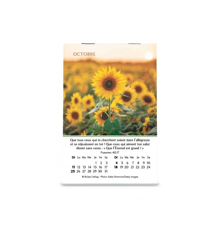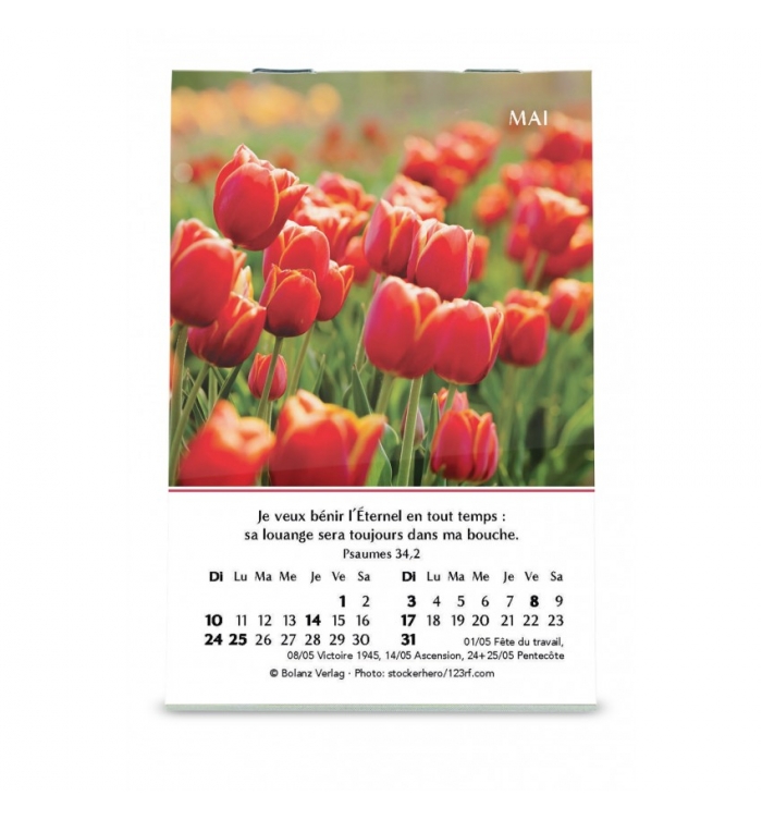 C'est le petit cadeau de qualité, idéal pour une large diffusion dans votre entourage : communauté, voisins, amis, relations d'affaires. 12 très belles images de fleurs avec textes bibliques. À poser.