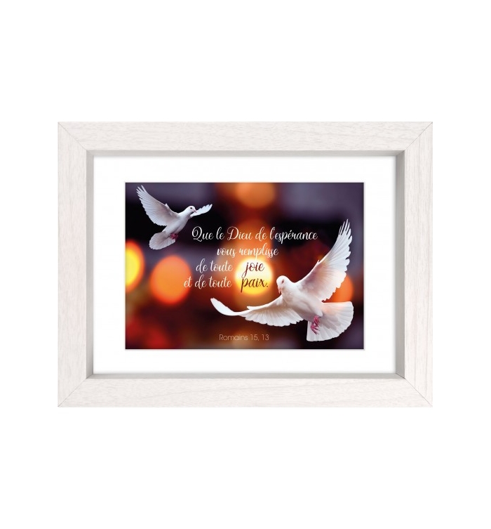 Joli cadre déco blanc Colombes et le verset : "Que le Dieu de l'espérance vous remplisse de toute joie et de toute paix." (Romains 15, 13)