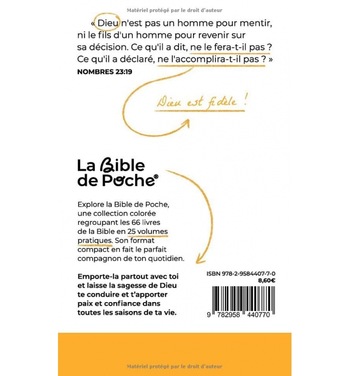 Bienvenue dans La Bible de Poche, une collection colorée rassemblant les 66 livres de la Bible en 25 volumes pratiques. Son format compact en fait le compagnon idéal pour accompagner chaque instant de votre vie. Emportez-la partout avec vous et laissez la sagesse divine vous guider, vous apporter paix et confiance dans toutes les saisons de votre vie.