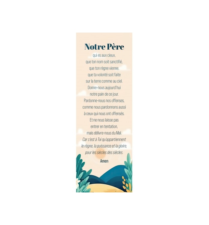 Un signet paisible illustré d'un magnifique paysage, parfait pour accompagner la prière du Notre Père.