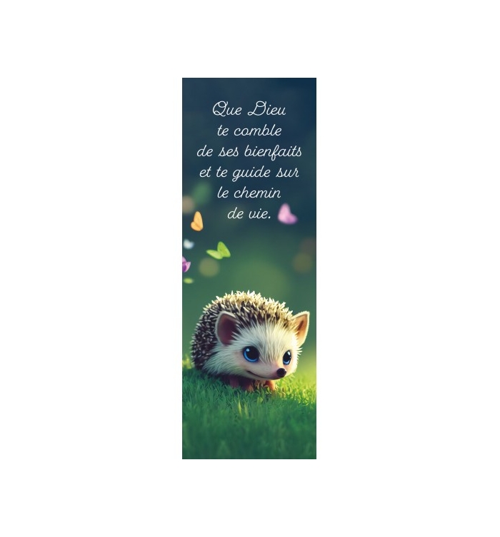 Un mignon hérisson se déplaçant dans l'herbe, accompagné d'un beau message : Que Dieu te comble de ses grâces et te guide sur le chemin de vie.