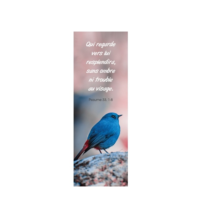 Joli signet "Oiseau bleu et rouge" avec le verset Qui regarde vers lui resplendira, sans ombre ni trouble au visage. (Psaume 33, 1-8)