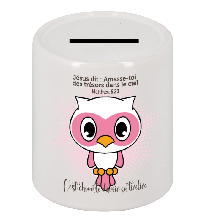 TIRELIRE CERAMIQUE CHOUETTE BLANCHE ROSE AMASSE-TOI DES…MATT.6.20
